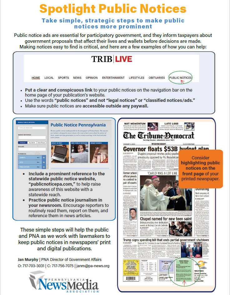 PNA members can take simple, strategic steps to make public notices more prominent. Public notice ads are essential for participatory government, and they inform taxpayers about government proposals that affect their lives and wallets before decisions are made. Making notices easy to find is critical. Download this flyer to learn how you can help.