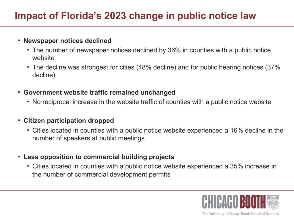 Delphine Samuels, an associate professor of accounting at the University of Chicago Booth School of Business, along with Yale School of Management professor Anya Nakhmurina and Texas A&M University assistant professor of accounting Kimberly Munevar conducted research into the evolving debate over whether placing public notices on government websites is an equal or superior alternative to newspapers. The researchers focused on Florida’s significant reform enacted in 2023 that allowed local governments to post legally required notices on county-operated websites and found that public participation decreased significantly and traffic to government websites did not increase. The following graphic reflects their findings: